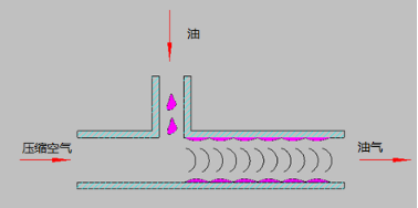 2 工作原理油气润滑是一种集中润滑方式,其原理是运用连续流动的压缩空气对间歇供给的稀油产生作用以形成涡流状的液态油滴并沿管壁输送至润滑点。利用压缩空气在管道内流动,带动润滑油沿管道内壁不断地流动,把油气混合体输送到润滑点。压缩空气以恒定的压力约0.3~0.4MPa,连续不断地供给,而润滑油则是要根据各个摩擦不同的消耗量定量供给。因此必须使用油泵作为输油的动力源,还有采用递进式给油器分别对各个润滑点供给所需要的油量。油气混合原理见图1.